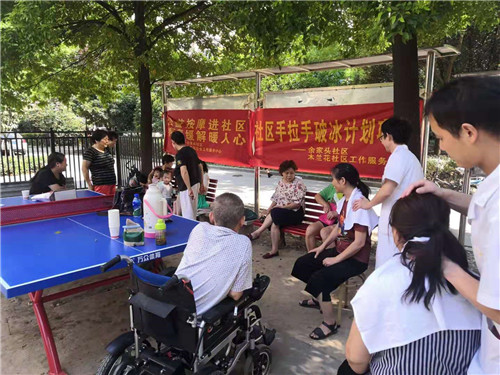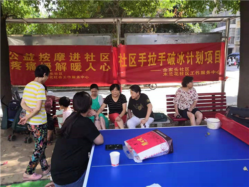 木蘭花社工與臻品足道的兩位專業(yè)按摩醫(yī)師早早的來(lái)到社區(qū)活動(dòng)廣場(chǎng),布置場(chǎng)地,準(zhǔn)備茶水,等待居民們的到來(lái)。居民們得到消息后紛紛來(lái)到活動(dòng)現(xiàn)場(chǎng),體驗(yàn)專業(yè)醫(yī)師的按摩理療。木蘭花社工為等候的居民們端茶遞水,聊著家常,拉近關(guān)系,了解居民需求。