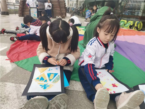 欣賞完了,我們也要開始畫畫了,坐在彩虹傘上,來往的叔叔阿姨都夸我們特別棒。