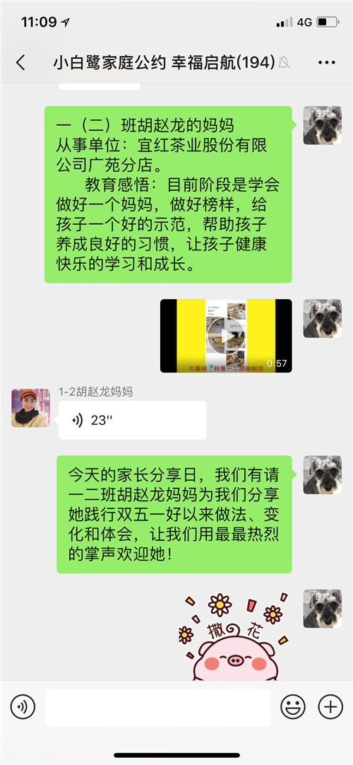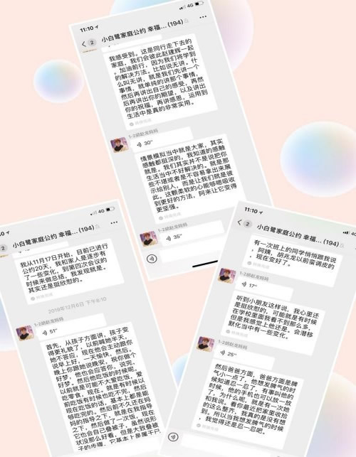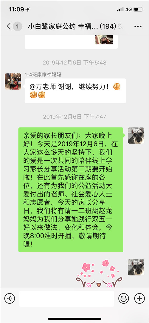 2019年12月6日晚8點(diǎn),白鷺街小學(xué)家庭公約—幸福啟航微信線上學(xué)習(xí)群家長(zhǎng)分享日,來(lái)自一(二)班的胡照龍媽媽為我們帶來(lái)了一場(chǎng)踐行家庭公約的經(jīng)驗(yàn)分享。胡照龍媽媽提到10月28日齊教授的家庭教育大講堂,讓她感受到了一次洗禮,并對(duì)齊教授的觀念表示深深的認(rèn)同,但是由于孩子太活潑在報(bào)名第一批互助家庭實(shí)踐的時(shí)候退縮了,后來(lái)在愛(ài)是一次共同成長(zhǎng)的主題教育活動(dòng)舉辦的時(shí)候聽(tīng)了一場(chǎng)洋洋老師帶來(lái)的家庭會(huì)議五部曲?;厝サ募彝プ鳂I(yè)就是開(kāi)一個(gè)家庭會(huì)議。雖然胡照龍媽媽表示當(dāng)時(shí)內(nèi)心有些抗拒,怕猛地一拉來(lái)開(kāi)會(huì)效果不好,但是內(nèi)心仍然十分認(rèn)同這些理念。