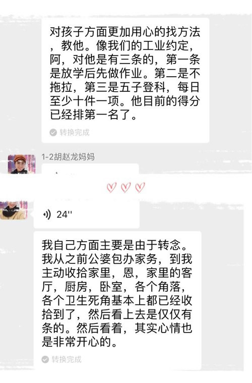 自第二次會(huì)議洋洋老師分享的對(duì)付小孩的妙招后,她開(kāi)始踐行”日念一好”。每一次活動(dòng)也都堅(jiān)持去參加學(xué)習(xí)。直到11月17日踐行家庭公約20天時(shí),家人也有了逐步的變化。有一次班上同學(xué)還悄悄“告狀”說(shuō)“阿姨,胡照龍以前滿調(diào)皮的,現(xiàn)在變好了”,從之前喊著半天都不答應(yīng)到現(xiàn)在早晨主動(dòng)問(wèn)好“早上好,一天愉快”;說(shuō)晚安是他也會(huì)應(yīng)答“好夢(mèng)”,之后在媽媽的指導(dǎo)下還做起了飯,疊起了被子。而爸爸脾氣也小了一點(diǎn),想發(fā)脾氣的時(shí)候也知道忍著了,從以前家長(zhǎng)會(huì)從不現(xiàn)身到現(xiàn)在終于去了一次,胡照龍媽媽利用這個(gè)改變的節(jié)點(diǎn)提出了開(kāi)一次家庭會(huì)議,原以為很難的事,大家都很開(kāi)心,全家福也拍上了。而自己也由于轉(zhuǎn)念的練習(xí),從之前的公婆包辦家務(wù)到主動(dòng)收拾,內(nèi)心也多了更多體諒。對(duì)孩子方面也更加用心的找方法,做了一次約定,第一條是放學(xué)后先寫(xiě)作業(yè),第二個(gè)是不拖拉,第三是做五子登科,在家庭公約評(píng)分統(tǒng)計(jì)表中,胡照龍?jiān)诩依镞b遙領(lǐng)先。