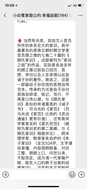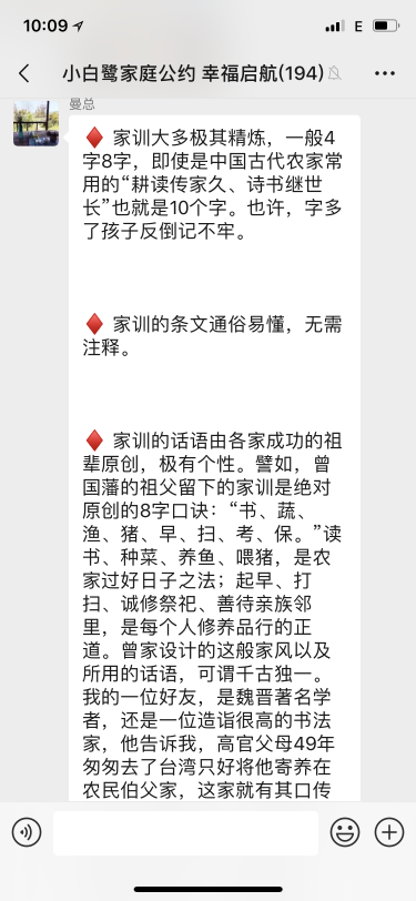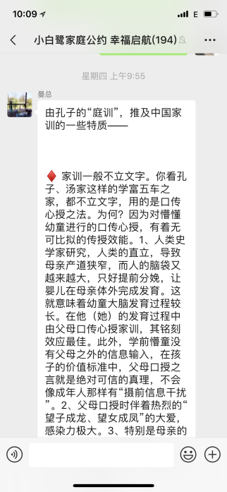 2019年12月12日,白鷺街小學家庭公約—幸福啟航微信線上學習群里,曼子老師從孔子的“庭訓”講起,推及中國的家訓特質(zhì)。她講到,古時家訓一般不立文字,像孔子、湯家這樣的學富五車之家,都是不立文字的,用的是口傳心授之法,對幼童進行口授心授有著無可比擬的傳授效能。因為人類的直立導致母親產(chǎn)道狹窄,而人的腦袋又越來越大,只好提前分娩,讓嬰兒在母親體外完成發(fā)育,這也就意味著幼童大腦發(fā)育過程較長,在其發(fā)育過程中的口傳心授家訓,其銘刻效果最佳。特別是母親的口傳心授,在諄諄言教之時便有切切身教之師范,說服力極強,所以母親被定義為“民族品格第一塑造人”。