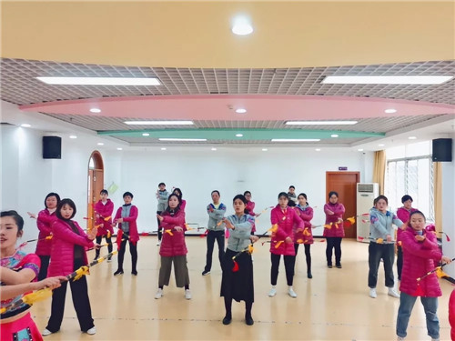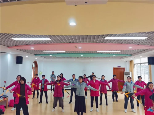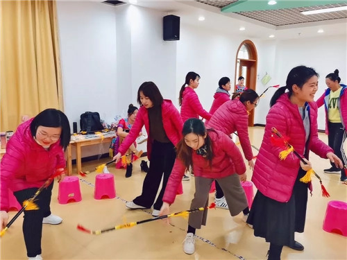 在向老師和鄧?yán)蠋煹闹笇?dǎo)下,幼兒園的老師們開始學(xué)習(xí)連廂,一遍又一遍的練習(xí),老師們熱情高漲。