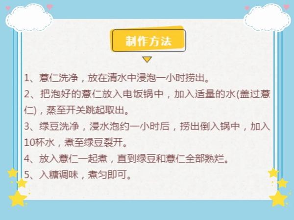 綠豆、薏仁在中醫(yī)里有利尿、改善水腫的效果,可使體內(nèi)毒素盡快排出。口味香甜,營養(yǎng)價(jià)值豐富。