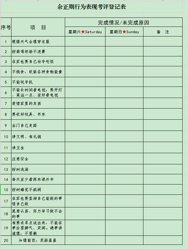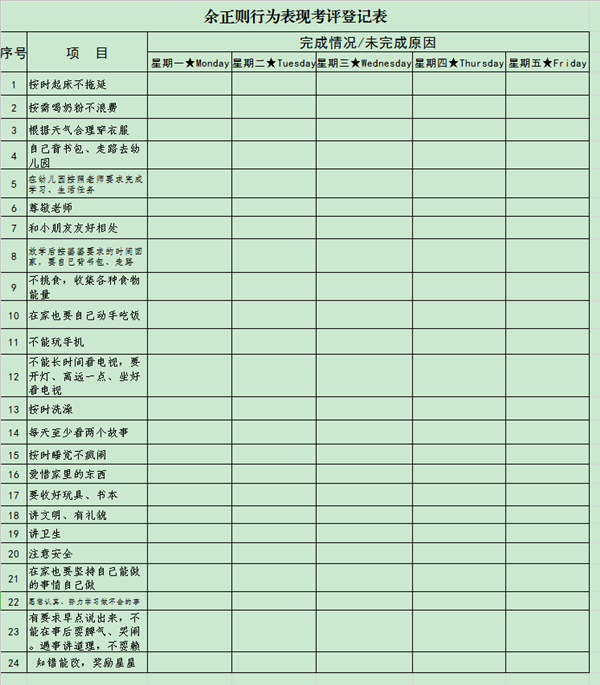 上幼兒園半年后,家里根據(jù)平時(shí)對(duì)余正則的行為要求,制定了《余正則行為表現(xiàn)考評(píng)登記表》。媽媽認(rèn)為,比起一句話的口頭提醒,具體到表格文字之后,能使小孩對(duì)事物有更加系統(tǒng)的認(rèn)知,意識(shí)到的確有某些事情要去執(zhí)行、遵守。表格包含20到24條行為要求,都是這個(gè)年齡段的孩子可以做到的。每天晚上家里人會(huì)對(duì)他的表現(xiàn)做一個(gè)總結(jié),哪些做得好,哪些沒(méi)做到,連續(xù)一周完成18條以上會(huì)得到獎(jiǎng)勵(lì)。