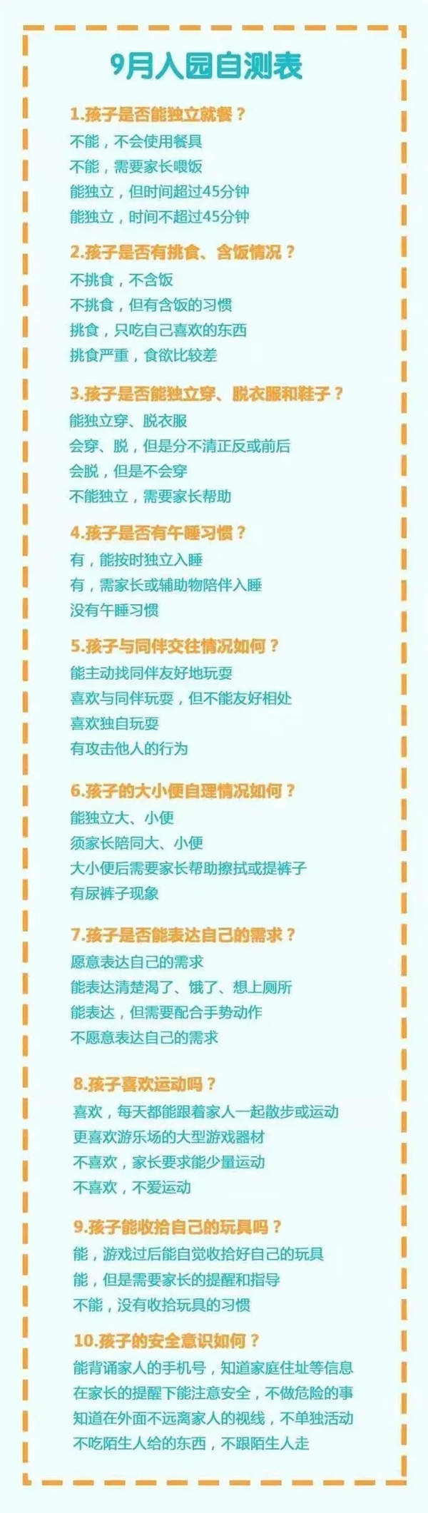 如果孩子全部能做到最好,恭喜您,孩子在幼兒園里一定能生活、學習的非常愉快!如果孩子有3—5項能力缺乏,別擔心,做好以上的準備工作,相信開學后孩子一樣能快速適應幼兒園生活。加油!我們不見不散!