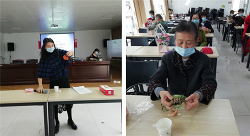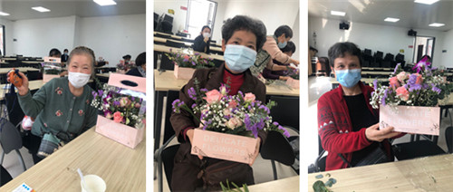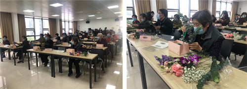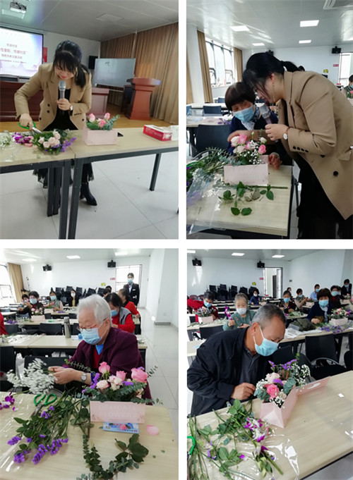 本次活動(dòng)的花藝環(huán)節(jié),專業(yè)花藝師何老師向參加活動(dòng)的老年居民朋友們講解了如何制作鮮花禮盒,并詳細(xì)介紹了插花“錯(cuò)落有致,交互輝映”手法原則?;顒?dòng)現(xiàn)場(chǎng)的老年朋友們?cè)诨ㄋ噹煹南ば闹笇?dǎo)下,均設(shè)計(jì)出了別具一格的花藝作品,面對(duì)自己的作品,老年朋友們都各個(gè)洋溢著滿意的笑容。