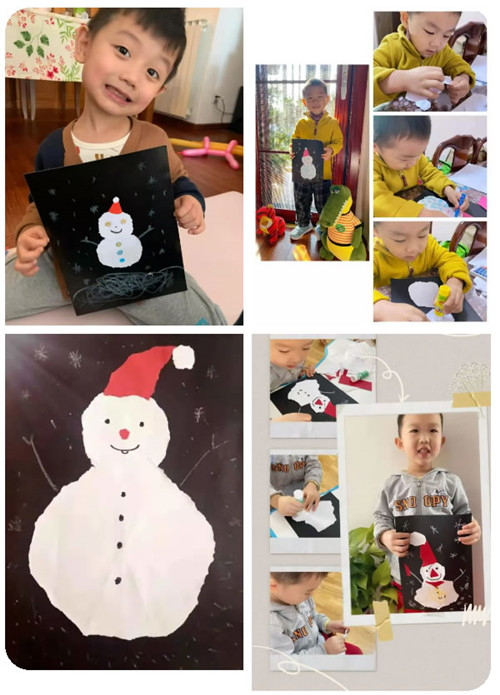 (3)用紅色彩紙剪出雪人的帽子和紐扣,并粘貼好。