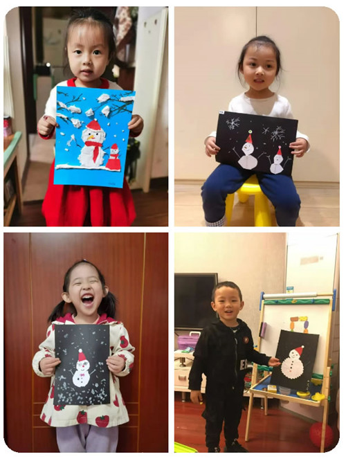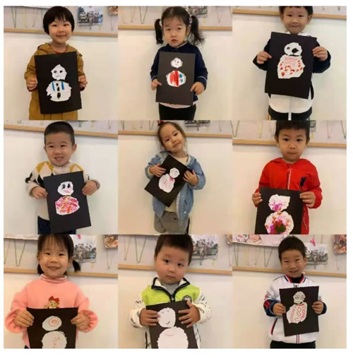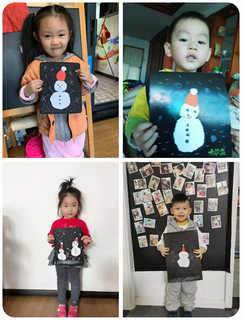 ?。?)將材料粘在黑色卡紙上,黑色記號(hào)筆畫出雪人眼睛和紐扣。
