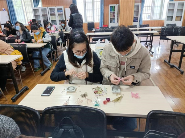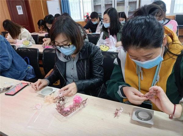 聽完老師的講解,學(xué)員們開始為自己的蠟片設(shè)計(jì)擺樣,老師邊講解邊指導(dǎo)。一片花瓣一片樹葉,都成為勾勒美景的神奇元素。純天然的材料散發(fā)陣陣自然的氣息,也使學(xué)員的心情逐漸安靜下來,專心致志的動(dòng)手制作著。