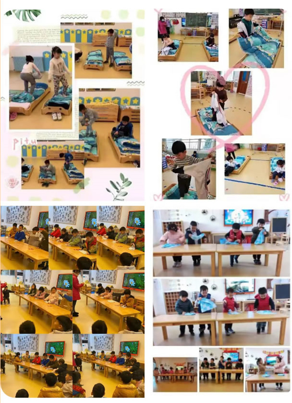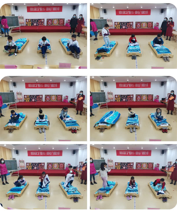 最后是大班組的比賽,比賽內(nèi)容為上床睡覺及起床的全流程。作為大班的哥哥姐姐,他們的比賽內(nèi)容是最復(fù)雜的,但一個(gè)個(gè)自信的笑容仿佛在告訴大家“這都不是事兒!”果然,瞧他們熟練的動(dòng)作,胸有成竹的表情,讓在場家長代表及老師又欣慰又自豪。