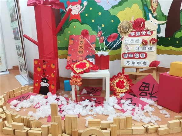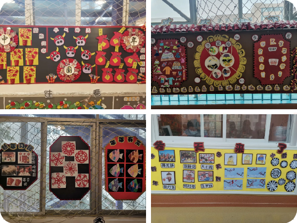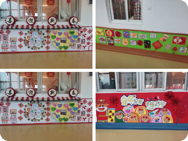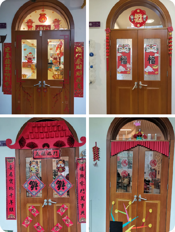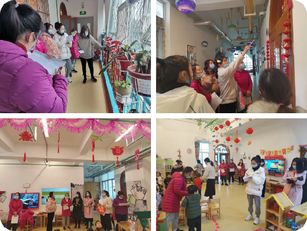 在評比過程中,老師們走進各個教室,由本班老師對班級主題墻創(chuàng)設、外墻布置及整體環(huán)創(chuàng)布置進行講解。豐富的細節(jié)設計、有趣的手工裝飾、合理的色彩搭配,各有各的特色,具有很強的操作性和參與性。剪窗花、拉彩條、寫福字、貼春聯(lián)、掛燈籠,一串串鞭炮、一碗碗元宵,真正做到各區(qū)有特色,處處有亮點。