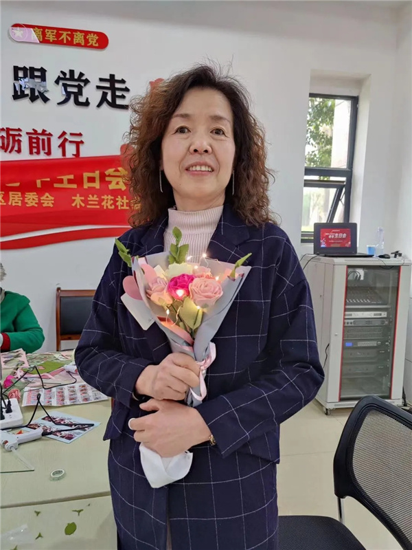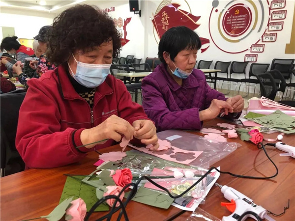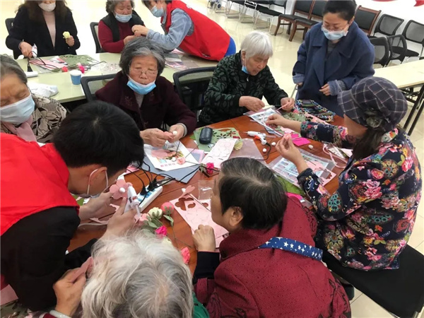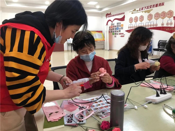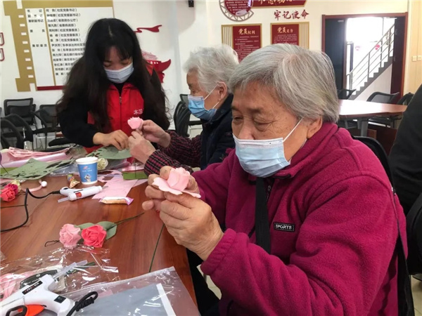 接下來(lái),是手工不織布花束的活動(dòng)環(huán)節(jié)。工作人員們將準(zhǔn)備好的不織布花束材料分發(fā)給現(xiàn)場(chǎng)的老年居民,由手工劉老師現(xiàn)場(chǎng)教授居民們?nèi)绾沃谱鞑豢棽蓟ǘ?,還提醒老年居民在使用熱熔膠槍時(shí)要注意的問題,避免燙傷。大家充分學(xué)會(huì)了制作技巧“拆、折、串、粘粘....”不一會(huì),一朵朵顏色艷麗的不織布花朵在老年人們的手中誕生,劉老師教大家用包裝紙把花朵包裝成精美的花束,再用燈珠做裝飾。老人們拿著自己親手做出來(lái)的不織布花束愛不釋手,每個(gè)人的臉上都露出了開心的笑容。