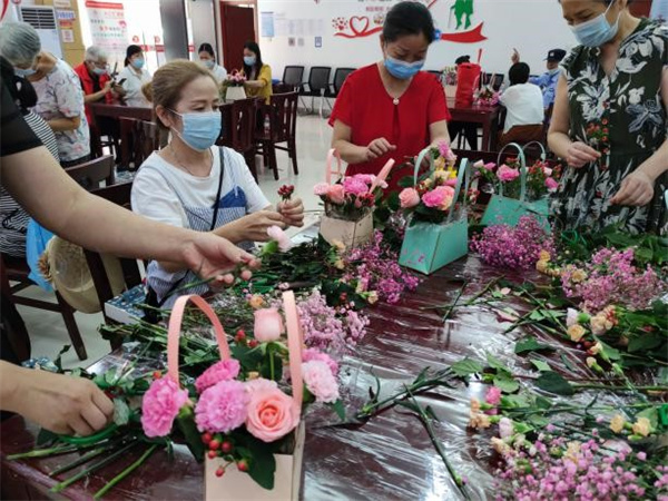 月餅制作完成后,大家迫不及待地進(jìn)入到另一個環(huán)節(jié)--插花。鮮花總是不分性別年齡地受到所有人的喜愛,在花藝師何老師的帶領(lǐng)下,帶著個人風(fēng)格色彩的小花籃呈現(xiàn)在大家眼前,為了配合八月十五玩花燈的習(xí)俗,何老師還特意為每個花籃都配上閃亮可愛的小串燈,看著居民們臉上洋溢著的幸福笑容,社區(qū)書記汪琳同志說:“她們高興我就開心”。