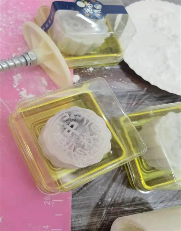 首先進(jìn)行的是冰皮月餅制作環(huán)節(jié),大家面前是早已分發(fā)好的食材及工具,認(rèn)真地聽從桂老師的講解,制作冰皮、分餡料、包月餅、撒干粉、壓模成型,不一會兒,一個個晶瑩剔透的冰皮月餅陸續(xù)在居民們手中誕生,也有些并沒有一次成功,老師會耐心來到居民身邊手把手教大家,壓模前干粉要適量,少了會粘住,多了沒花紋,手一定要把模具底部扶穩(wěn)壓緊,否則會擠出模具外……參加此次活動的周阿姨迫不及待地品嘗了自己的作品,樂呵呵地對工作人員說:“這自己做的月餅就是不一樣,吃著嘴甜心也甜……”。