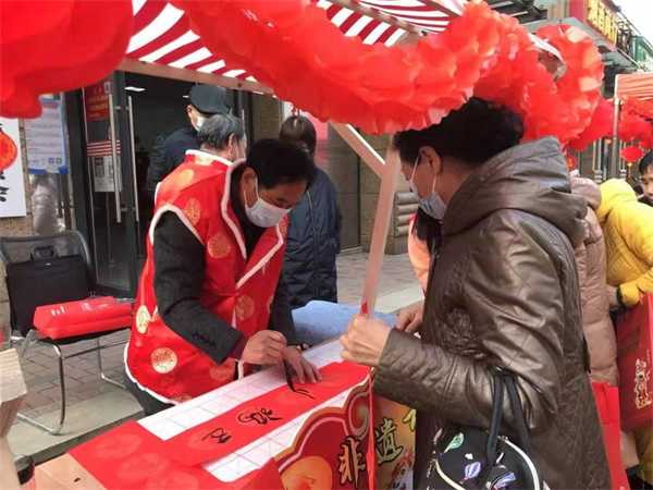 寫春聯(lián)攤位前,大家有序排隊?!案M乾坤萬木新,春歸大地千山暖?!苯舆^這副由湖北書畫院院長寫下的春聯(lián),居民們非常開心。春聯(lián),又叫“春貼”“門對”,是筆尖上陳久彌香的年味,是民俗中傳承千年的寶藏,書法老師寫了近百副春聯(lián)及福字,送給了在場的居民們。