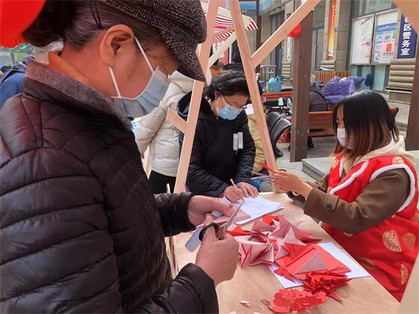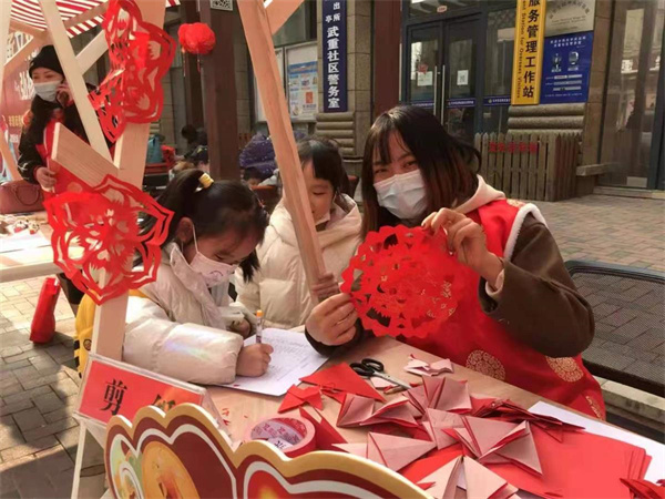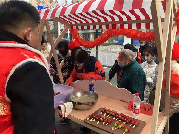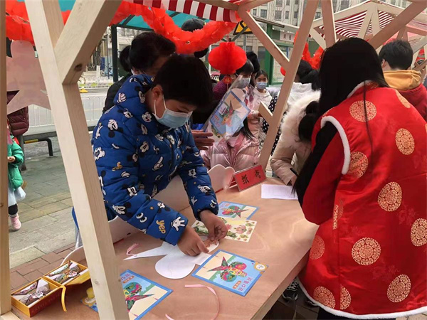 當(dāng)天下午,武重社區(qū)居委會門口張燈結(jié)彩,人潮涌動。寫春聯(lián)、剪窗花、皮影制作、糖畫、糖葫蘆、畫紙鳶、套圈等攤位,吸引了越來越多的居民。大家自主選擇想要體驗的非遺項目,讓原本顯得“高冷”的“非遺文化”更接地氣。