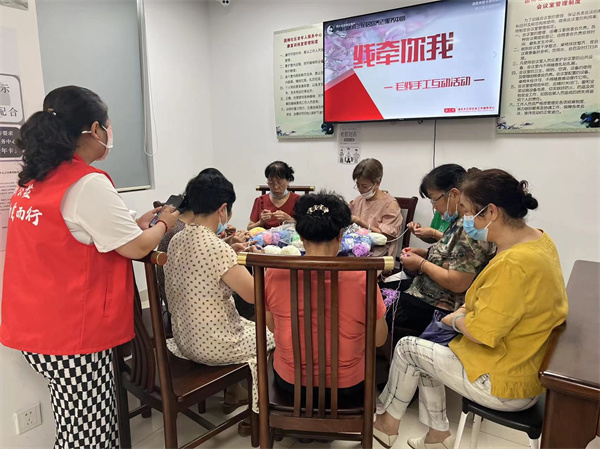 為鍛煉老年人居民的手部靈活,發(fā)揮他們的創(chuàng)新思維,滿足他們愛好手工藝的需求,讓他們能夠“老有所學(xué),老有所樂”。國棉社區(qū)木蘭花居家養(yǎng)老服務(wù)中心特開展了一場“線牽你我”為主題的毛線手工互動活動。本次活動吸引了10余名老人參加,活動現(xiàn)場,大家都認(rèn)真動手編織,遇到不熟練的地方就虛心請教、相互交流學(xué)習(xí),居民們表示:“和大家一起參與手工活動真的很開心,及鍛煉動手能力又充實了生活”?;顒咏Y(jié)束,大家?guī)е约旱某晒黄鹋南麓蠛险眨炎髌妨粼诶夏攴?wù)中心作為展示。