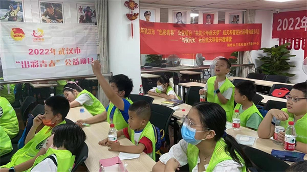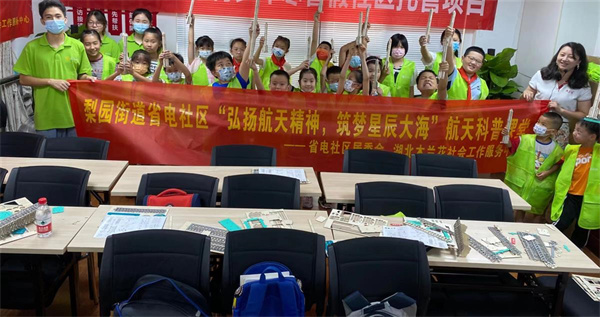 7月14日,在2022年武漢市“出彩青春”公益項目的大力推薦下,武漢市洪山區(qū)梨園街道省電社區(qū)聯(lián)合湖北木蘭花社會工作服務(wù)中心,在社區(qū)二樓暑假社區(qū)托管室開展“弘揚航天精神,筑夢星辰大?!焙教炜破照n堂。