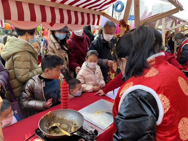 在一片歡呼聲中,廟會活動拉開了帷幕。廟會里設(shè)有畫糖畫、棉花糖、糖葫蘆、兔子燈籠等打卡攤位,小朋友和大人們可以選擇自己喜歡感興趣的項目,體會中國傳統(tǒng)節(jié)日氛圍。除了美食,現(xiàn)場還有獨(dú)具年味的游戲活動,套圈、猜燈謎……廟會把民俗融入游戲,讓大家在游戲中感受中國年的氛圍!居民還可在廟會中參與手工學(xué)習(xí)和制作,現(xiàn)場體驗手作的樂趣,制作好的兔型燈籠,亮起燈很有節(jié)日氣氛。