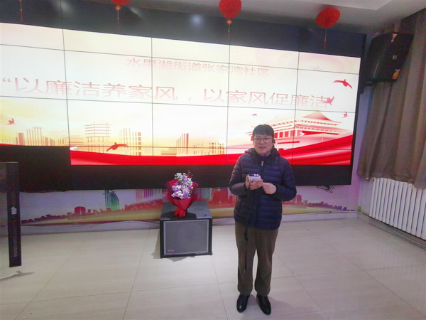 張家灣社區(qū)黨委書記高桂萍為廉潔家庭代表們獻花。她說,家風是中華民族的優(yōu)秀傳統(tǒng)文化,良好家風是新時代干事創(chuàng)業(yè)的助推器,社區(qū)舉行這場活動,起到了傳播好家風,推動廉潔文化深入人心的效果。