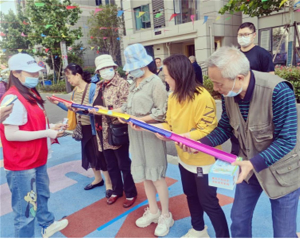 活動還未正式開始,居民們便圍在項目周圍,躍躍欲試?;顒娱_始后,體育老師便召集大家做熱身運動,穿上隊服,參加“無敵風火輪”“巧接彩珠”“珠行萬里”等趣味項目?;顒赢斨?,新就業(yè)群體是一道亮麗的風景線,其中外賣小哥、快遞員、網(wǎng)約司機在游戲中脫穎而出,展現(xiàn)出他們的“職業(yè)速度”。一旁的孩子們也爭先恐后地參與到游戲當中,體驗團隊協(xié)作的幸福感。共建單位代表隊與商鋪代表隊“同臺競技”,拉近彼此距離,凝心聚力。率先集齊四個項目印章的居民迫不及待地拿著禮券抽獎,抽中自己心儀獎品的居民十分高興,大方熱情地向志愿者們展示自己的禮物。