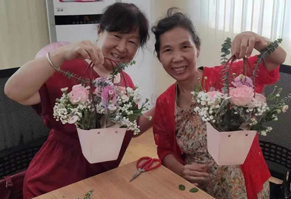 大家拿著剪刀把鮮花斜著剪出合適的高度,然后根據(jù)自己的喜好,在花籃的花泥中依次插入主花、配花。所有人都很認真,沉浸在花香中。一朵朵鮮花在居民手中綻放,粉色的玫瑰、熱情的波斯菊、溫馨的康乃馨、紫色的桔?;ā⒗寺臐M天星、翠綠的尤加利,鮮花最終匯聚成一件件精美的作品。花藝DIY完成后,大家紛紛拍照留念。居民朱奶奶說:“感謝社區(qū),感謝木蘭花社服機構(gòu),讓大家參加有意義的插花活動,豐富了大家的業(yè)余生活?!?/p>