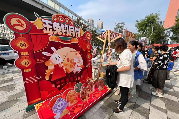 活動現(xiàn)場,居民們還可參與手工制作,現(xiàn)場體驗手作的樂趣,制作好的兔型燈籠,亮起燈在居民們手中很有節(jié)日的氣氛。小朋友左手一個糖畫、右手一個冰糖葫蘆,排在釣月餅攤位前,等著釣起自己中意的小禮品,樂此不疲。參與活動的居民在歡快的打卡活動中,一起領(lǐng)略中秋民俗之美,在歡聲笑語中增進鄰里情。