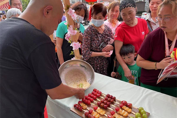 在畫糖畫攤位,非遺傳承老師根據(jù)糖料的特性,用精湛的文字藝術(shù),畫出了“美好生活共同締造”字樣,展示給現(xiàn)場圍觀的居民,居民們紛紛拍手叫好。“這幅糖畫挺有趣的,現(xiàn)在不太看得到了,我們小時候見過,讓我想起了甜蜜的童年?!本用駛冋f。