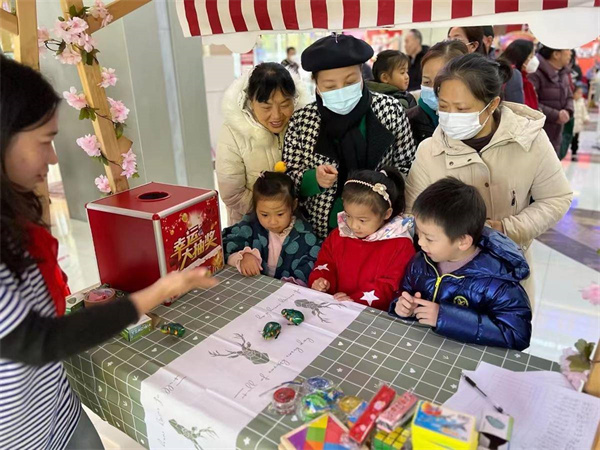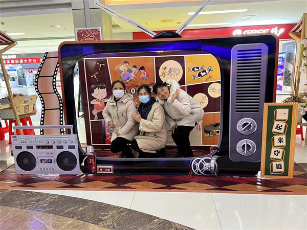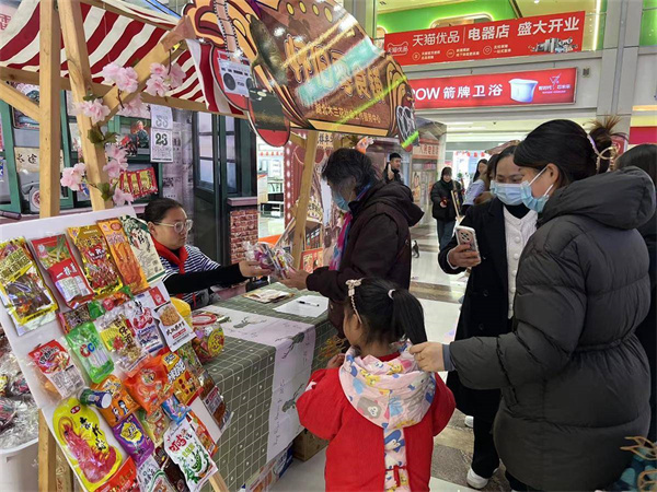 懷舊市集設(shè)“冰糖葫蘆”“兒時風(fēng)車”“畫糖畫”“兒時玩具”“懷舊套圈”“童年游戲”“懷舊零食鋪”“洞洞樂”八大板塊,60后、70后、80后的“大孩子”帶著00后、10后的“小孩子”穿梭其中,玩得不亦樂乎,活動現(xiàn)場成了歡樂的海洋?!斑青辍币宦?,隨著相機快門響起,一張張“童年回憶錄”將一個個溫馨幸福的瞬間定格。