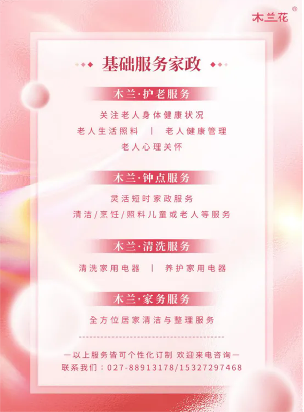除了個性化高端定制服務(wù),木蘭花家政還為武漢市民提供7大類26項(xiàng)普惠基礎(chǔ)家政服務(wù)。