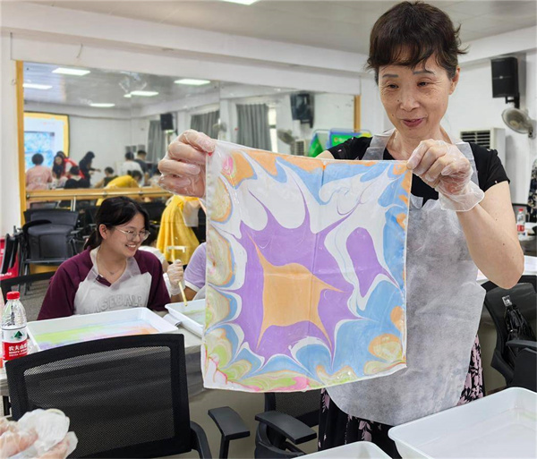 “原來水拓絲巾是這樣制作的,之前在手機里看過,第一次動手做,好看……”居民們相互贊賞,臉上洋溢著滿滿成就感。