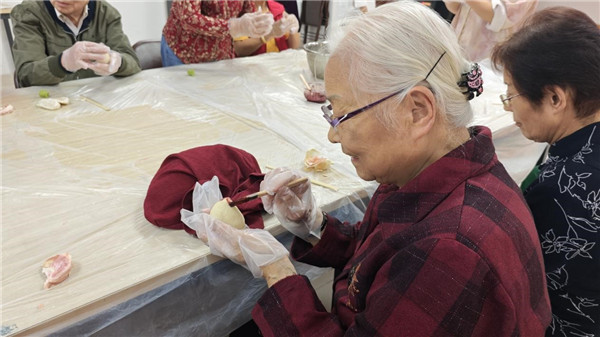 壽桃花饃不僅造型精美,寓意長壽與吉祥,還承載著深厚的民俗文化和人們對(duì)美好生活的向往。因此,此次別開生面的非遺中式面點(diǎn)制作活動(dòng),特別選擇壽桃花饃這一傳統(tǒng)手工藝品作為學(xué)習(xí)與制作的對(duì)象?;顒?dòng)邀請(qǐng)面點(diǎn)老師向大家講解壽桃花饃的歷史背景、文化寓意及制作技巧。接下來,老師現(xiàn)場示范和面和揉面,當(dāng)面揉的比較光滑后,分成大小相同的介子,再用手掌揉成水滴狀,最后用筷子壓痕,并加上兩片綠色葉子狀的面,一個(gè)壽桃花饃就制作成功了。老人們?cè)诿纥c(diǎn)老師的指導(dǎo)下制作出壽桃花饃。社工們將制作好的壽桃放在蒸鍋上蒸。
