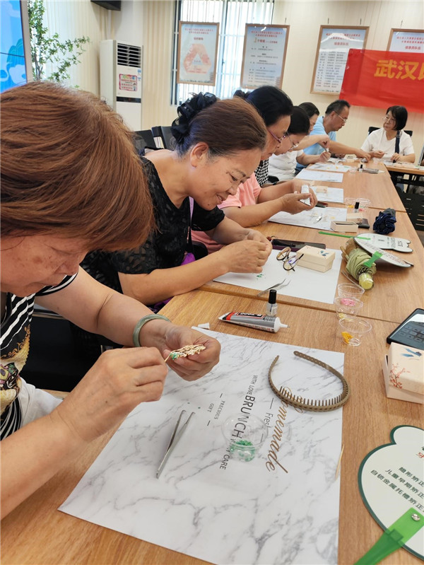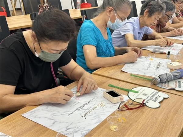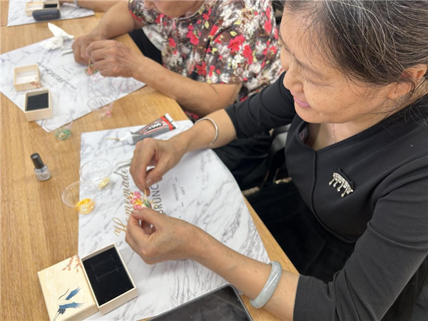 活動伊始,老師向大家詳細介紹了七夕節(jié)的由來,牛郎織女的美麗傳說以及這一傳統(tǒng)節(jié)日所蘊含的文化內(nèi)涵,讓大家對七夕節(jié)有了更深刻的認識和理解。隨后老師帶領(lǐng)居民一同學(xué)習(xí)制作一款精美的非遺螺鈿胸針,以寄托對節(jié)日美好的祝福。老師在活動過程中講解了螺鈿技藝的歷史起源、發(fā)展過程以及制作方法,讓參與居民對這一傳統(tǒng)技藝有了更全面的了解。在制作環(huán)節(jié),大家在老師的指導(dǎo)下,將一片片細小的螺鈿片鑲嵌在底胚上,色彩與圖案,搭配螺片本身所具有的色澤與肌理,賦予了每件作品不同的神韻,也展現(xiàn)著大家無限的創(chuàng)意。一枚枚精致而獨特的胸針便制作完成,大家既驚嘆中華民族傳統(tǒng)非遺技藝的高超,又成就感十足,對自己的作品愛不釋手。