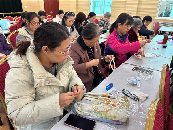 貝殼風(fēng)鈴?fù)ǔJ怯删x的天然貝殼手工制作而成,其制作技藝涉及貝殼的采集、挑選、加工、設(shè)計、組裝等多個環(huán)節(jié)。這些技藝往往體現(xiàn)了制作者對手工藝品美感的追求和對傳統(tǒng)文化的尊重。其制作技藝被認定為非物質(zhì)文化遺產(chǎn)的一部分,書法貝殼風(fēng)鈴融入了非遺元素,為非遺文創(chuàng)的一種表現(xiàn)形式。社工將制作的貝殼、魚線、竹筐、棉線、玻璃蝴蝶、書法貼紙等材料分發(fā)給居民,在老師的指導(dǎo)下,大家開始制作書法風(fēng)鈴。現(xiàn)場的居民非常認真的將棉線穿過竹筐打結(jié),再將玻璃蝴蝶和白色貝殼依次穿過魚線,并有次序間隔的固定好,做成一串一串的。最后將所有穿好的貝殼固定在竹筐上,貼上書法貼紙,國潮貝殼風(fēng)鈴就做好了。探索書法與蝴蝶貝殼風(fēng)鈴這一傳統(tǒng)手工藝品結(jié)合的新方式,為非遺文化注入新鮮血液,吸引更多人關(guān)注和參與非遺保護。