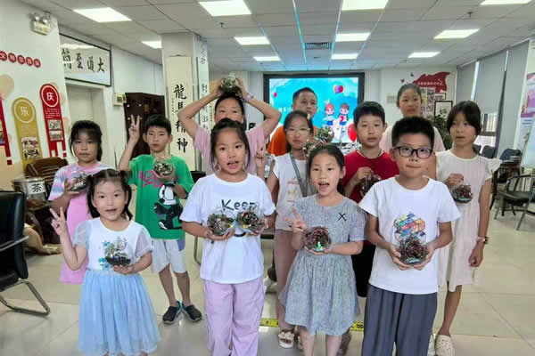 第二場活動是“生態(tài)環(huán)保微景觀制作”。結(jié)合社區(qū)綠化養(yǎng)護(hù)與生態(tài)治理需求,社工先向孩子們科普社區(qū)生態(tài)系統(tǒng)構(gòu)成、植物養(yǎng)護(hù)知識,以及微景觀對改善局部環(huán)境、提升社區(qū)美觀度的作用,隨后給大家分發(fā)玻璃容器、多肉植物、營養(yǎng)土、裝飾砂石等材料,指導(dǎo)大家根據(jù)植物生長特性,分層鋪設(shè)基質(zhì)、搭配植物、設(shè)計景觀,親手制作專屬生態(tài)微景觀。活動中,大家不僅掌握了植物養(yǎng)護(hù)的科學(xué)方法,更通過微觀生態(tài)模型,理解了社區(qū)宏觀生態(tài)治理的“平衡理念”。