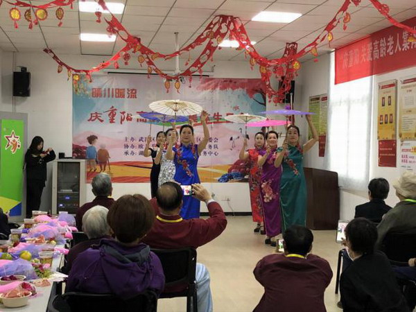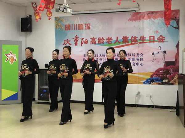 旗袍秀的志愿者們?yōu)槔蠅坌莻儙砹苏凵任琛冻ㄏκ啊泛蛡阄琛度绿一ㄓ辍?,舞者們身材婀娜多姿,手中的折扇和傘靈活變化,老壽星們一飽眼福。