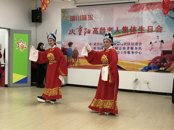 其中,“湖北大鼓”的表演者王建賀志愿者為老壽星們帶來了湖北傳統(tǒng)的說唱藝術(shù),王老師聲音洪亮,現(xiàn)場的氣氛一下就到了一個(gè)高潮。